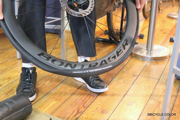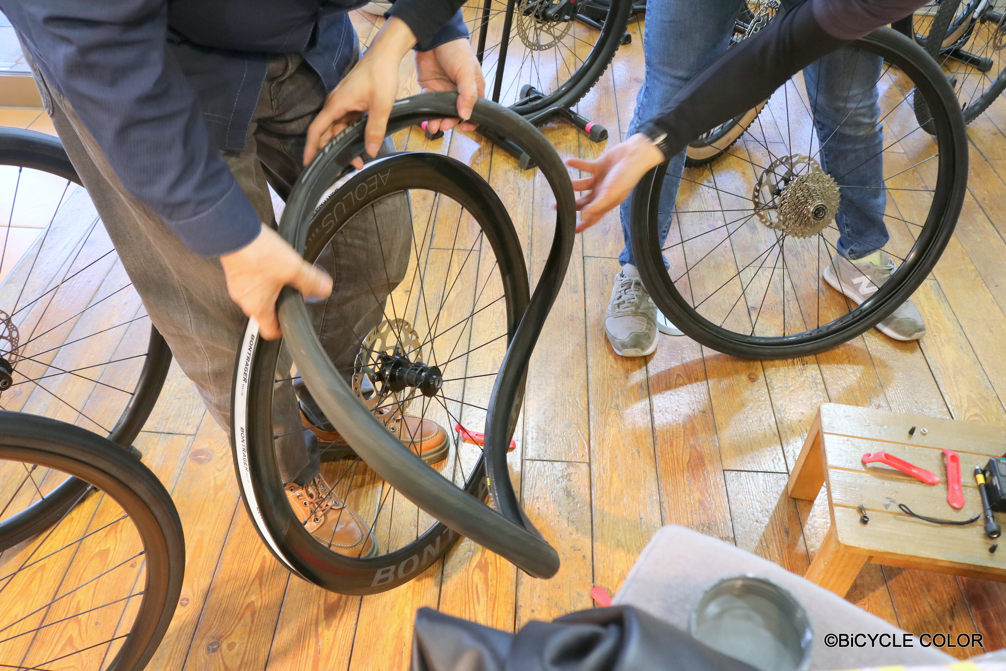 タイヤをはめる前に空気を入れすぎると破損したりするため、的確に作業できるコツを解説し、実践いただきました。